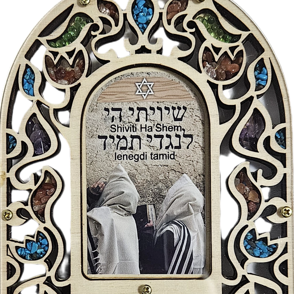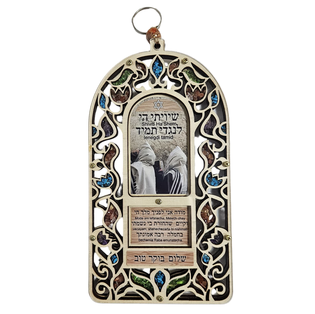 Transforme o seu espaço com a Peça Decorativa em Madeira que traz as duas primeiras preces que todo judeu recita ao acordar: o Shiviti e o Modê Ani. Esta peça única, feita com uma combinação de madeira, acrílico e pedras, é mais do que um simples objeto decorativo – é uma verdadeira celebração da fé e da tradição.